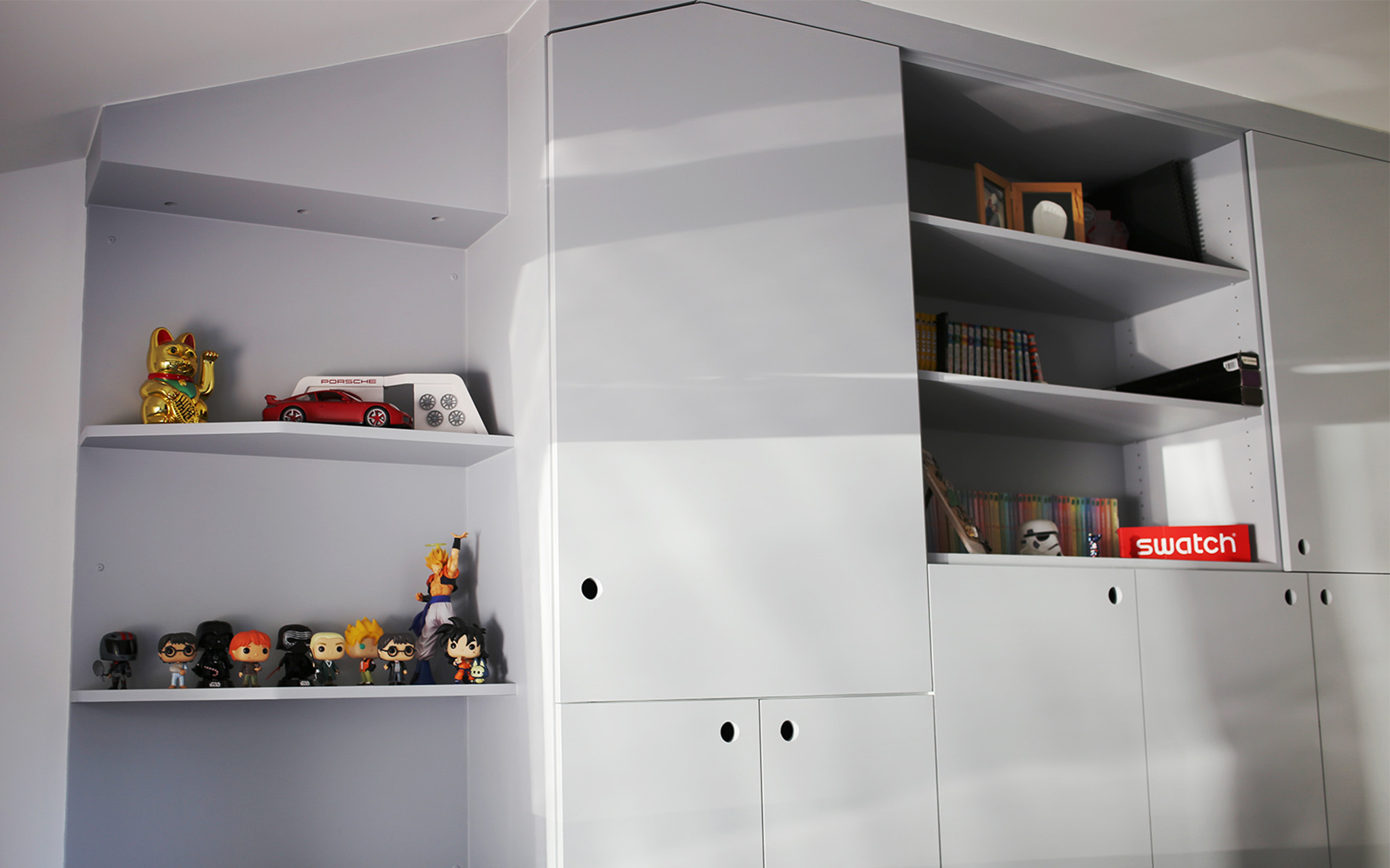 Création d’une chambre pour un adolescent dans un garage en modifiant la façade pour intégrer une fenêtre. La chambre est structurée par un meuble sur-mesure qui se déroule sur tout un pan de mur. La salle-de-douche est complétement ouverte sur l’espace de la chambre pour plus de luminosité et limiter le cloisonnement d’un petit espace.