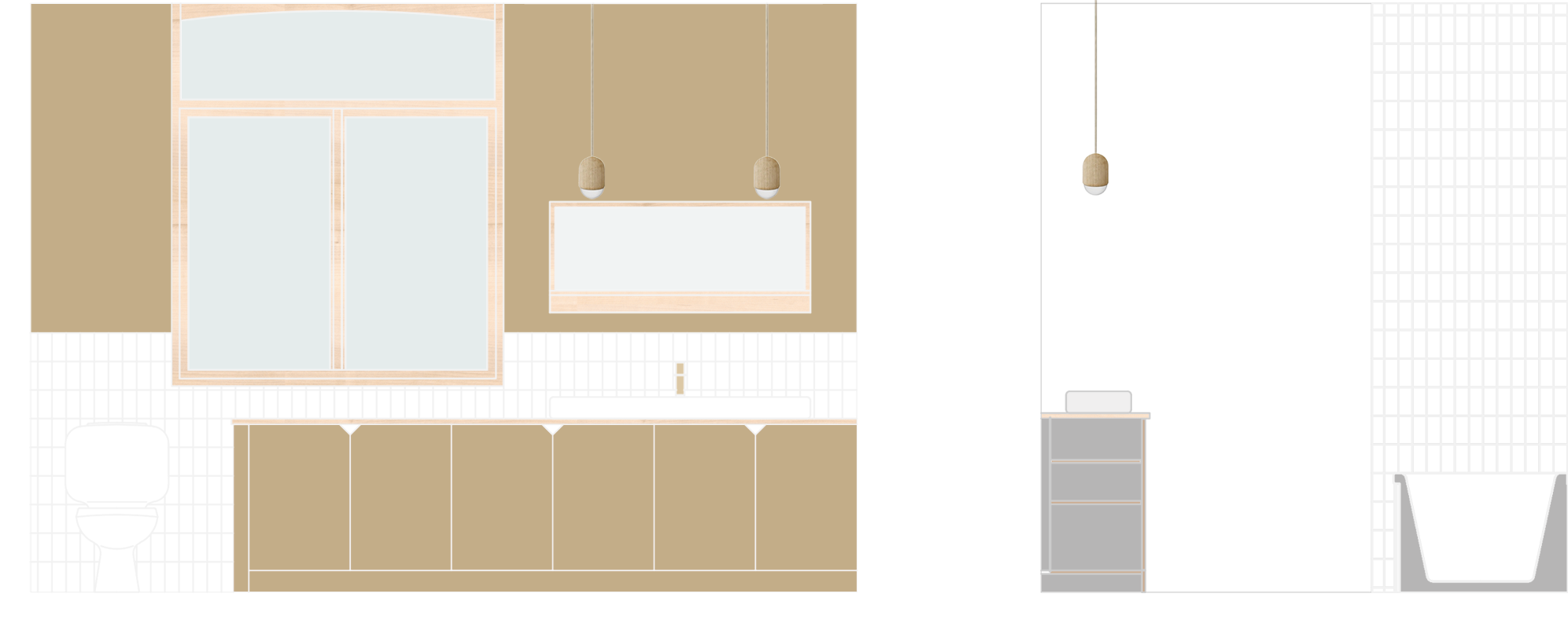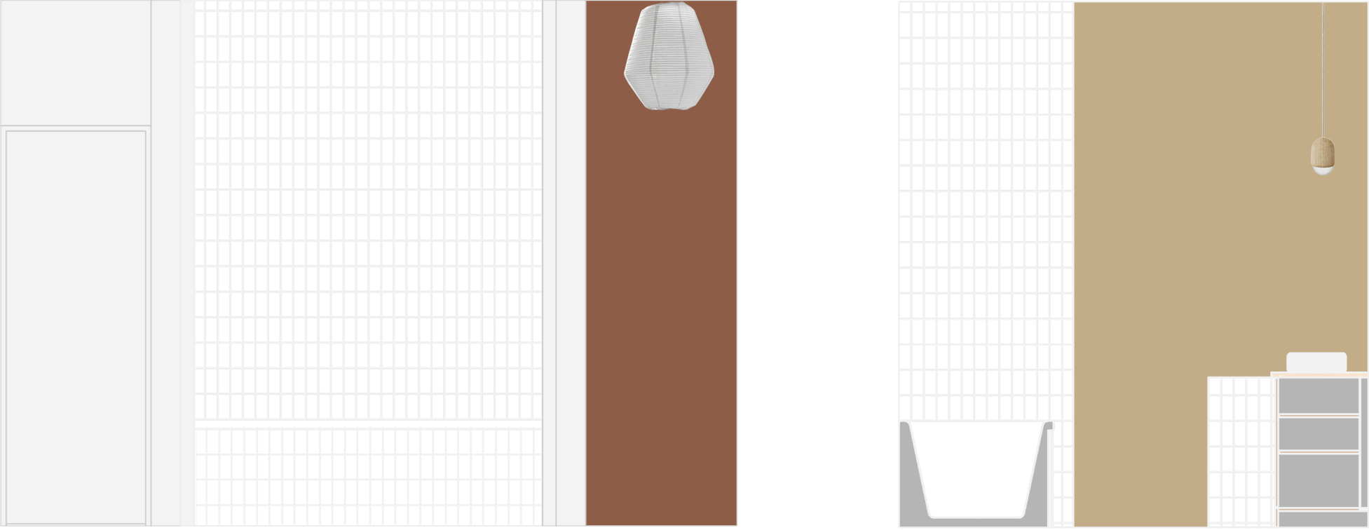 Rénovation d‘une salle-de-bain avec pour fil conducteur de départ le choix d’un carrelage imitation bois par les clients. La pièce d’origine était très sombre avec des dysfonctionnements techniques et non fonctionnelle. Le projet prévoit donc de retrouver une ambiance plus lumineuse tout en proposant de dissimuler le WC derrière une cloison mi-hauteur, de créer un espace caché dédiée à la machine à laver et un meuble de rangement généreux sur-mesure avec une grande vasque et une baignoire.